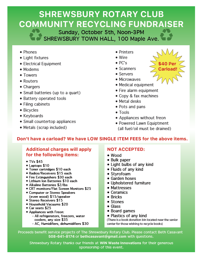 🌟 Shrewsbury Rotary Club's Semi-Annual Recycling Event: A Resounding Success! 🌟 An info graph of all items recycled and not added to a landfill! On April 7th, the Shrewsbury Rotary Club hosted its semi-annual recycling drive, and the turnout was phenomenal! Thanks to the support of our community and the dedication of our volunteers, we were able to collect a staggering array of electronics and household items for recycling.